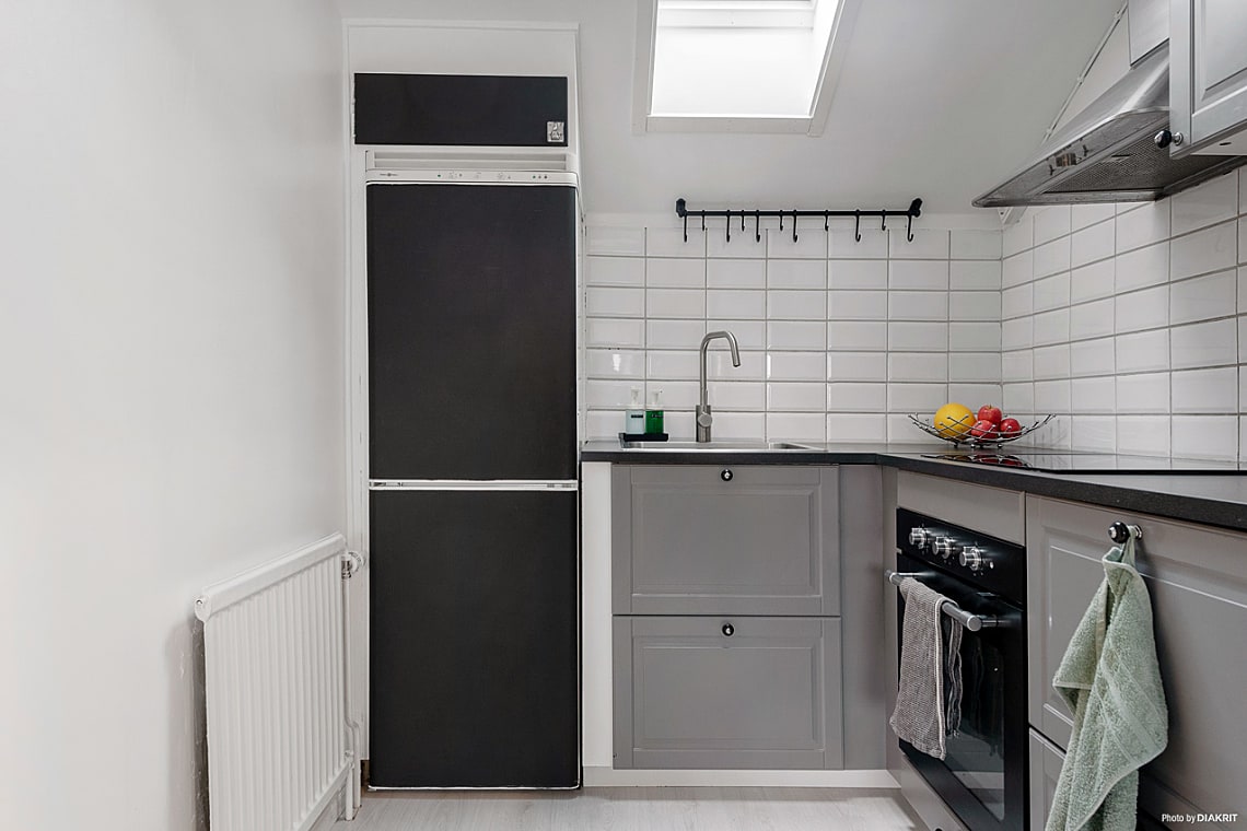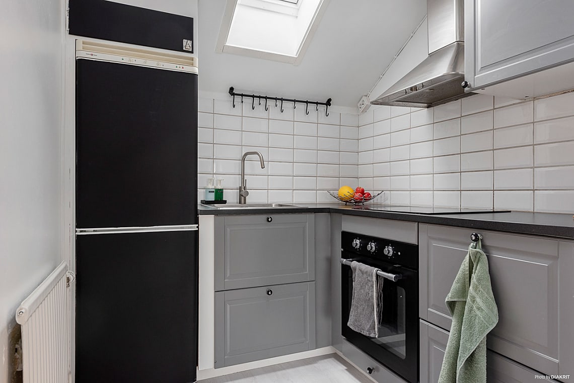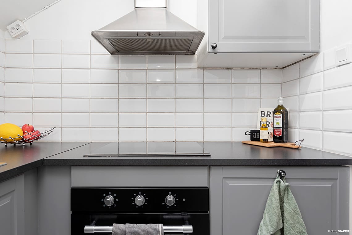 Charmig och stilfull köksdel medskåpsförvaring och arbetsyta. Här finns inbyggnadsugn, spishäll, fläkt och kyl/frys.