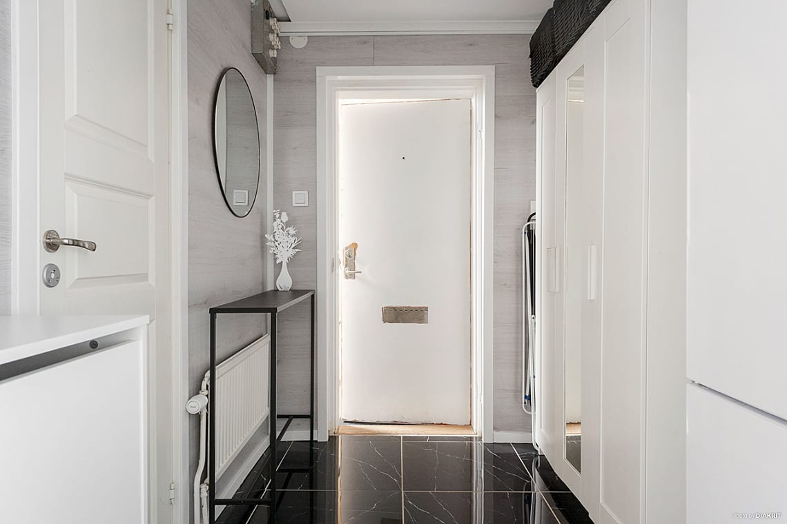 Välkomnande hall med plats för avhängning av ytterkläder och skor. Garderob för förvaring.