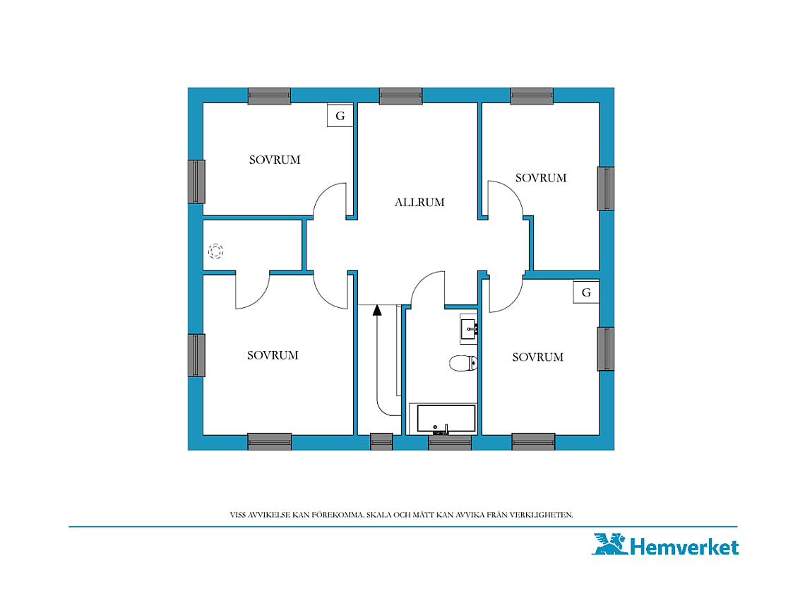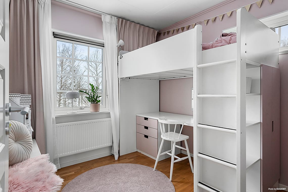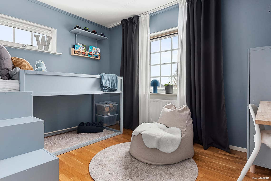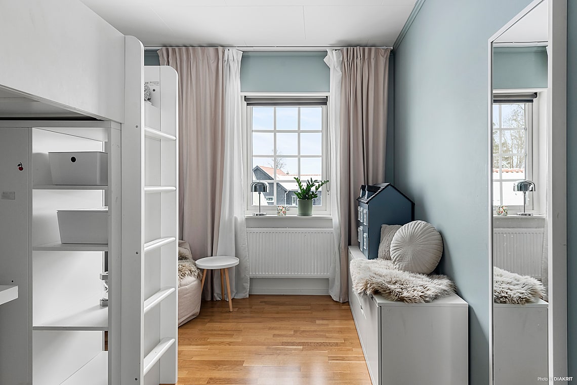 På övre plan finns fyra fina sovrum i bra storlek, samtliga med goda möbleringsmöjligheter. Rummen lämpar sig väl som barnrum, gästrum, kontor eller föräldrasovrum och erbjuder plats för säng, förvaring och skrivbord.