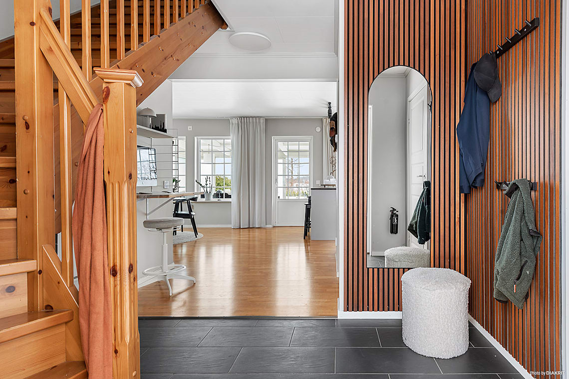 Ljus hall med plats för avhängning av ytterkläder och skor.
