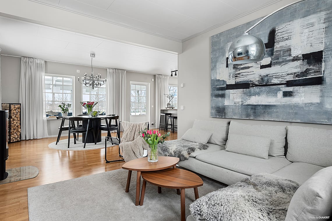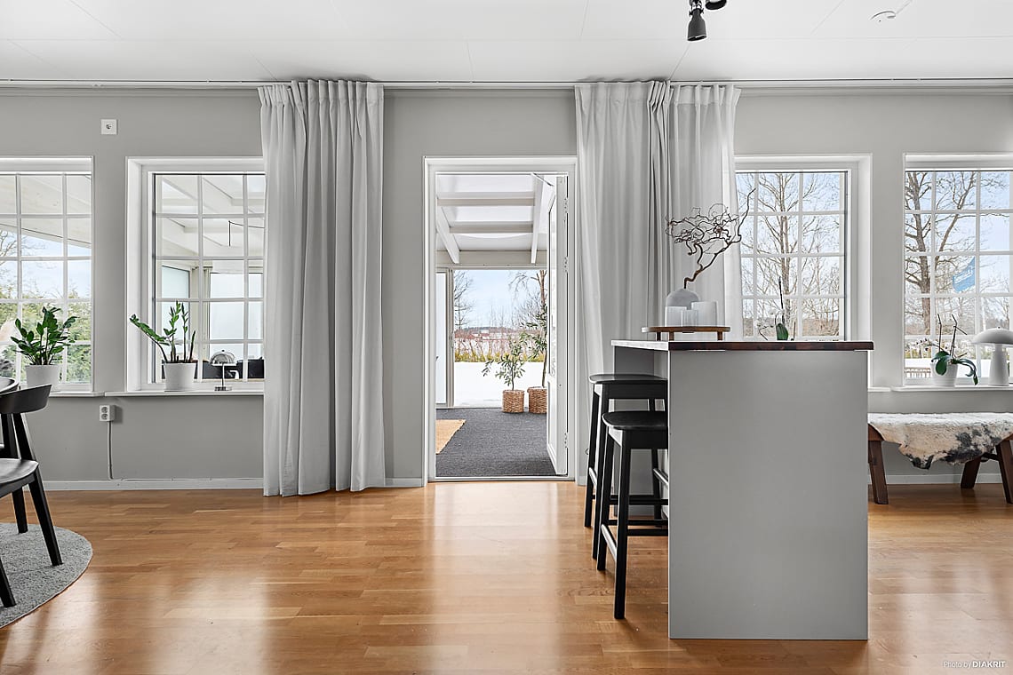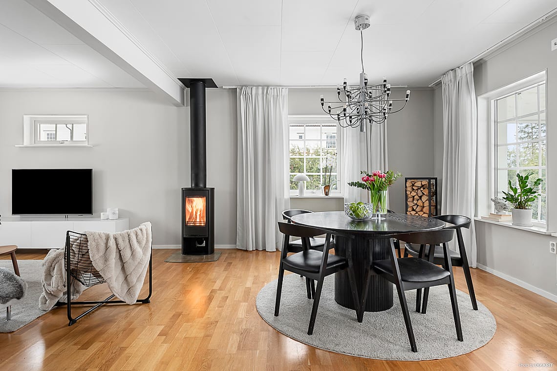 Vardagsrum med härlig och luftig känsla. Stora fönster partier åt flera väderstreck ger rummet ett behagligt och naturligt ljus. Här finns även en kamin som värmer gott under årets kallare dagar. Utgång till bostadens inglasade uterum och vidare ut till trädgården.