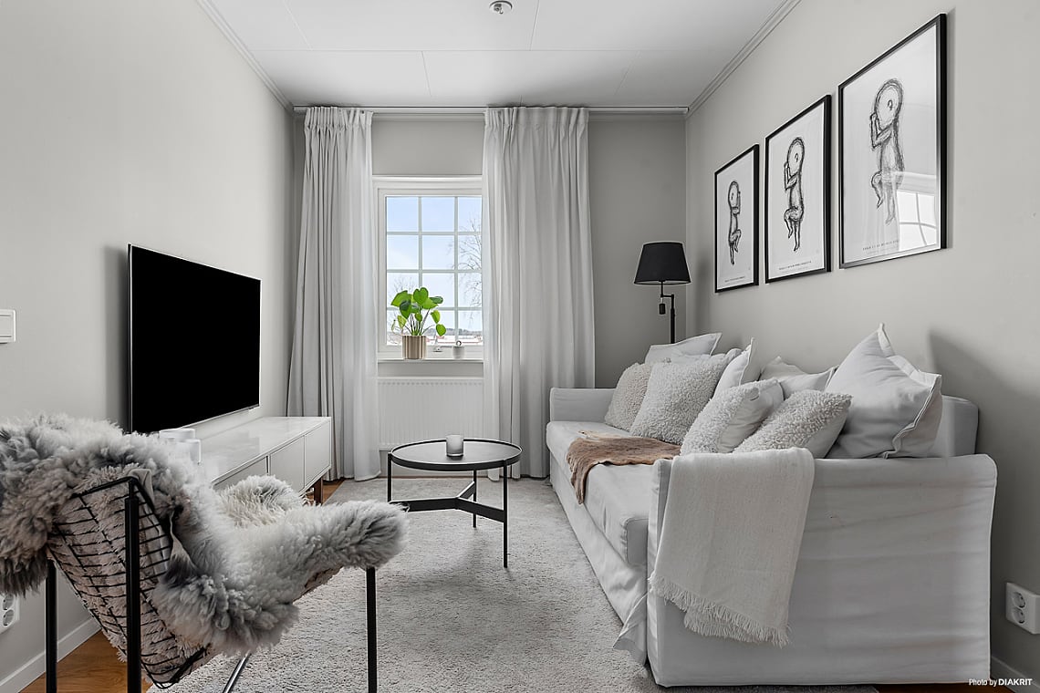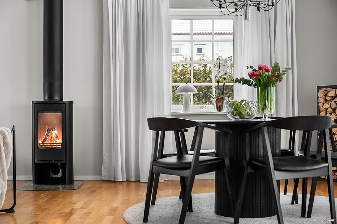 Bostaden präglas av ljus, rymd och en social atmosfär där kök och vardagsrum samspelar i en öppen planlösning. De stora fönsterpartierna ger ett härligt ljusinsläpp från flera väderstreck och i vardagsrummet skapar kaminen både värme och trivsel under årets kallare månader. Härifrån nås även det inglasade uterummet som förlänger utesäsongen och leder vidare ut till den lättskötta trädgården.