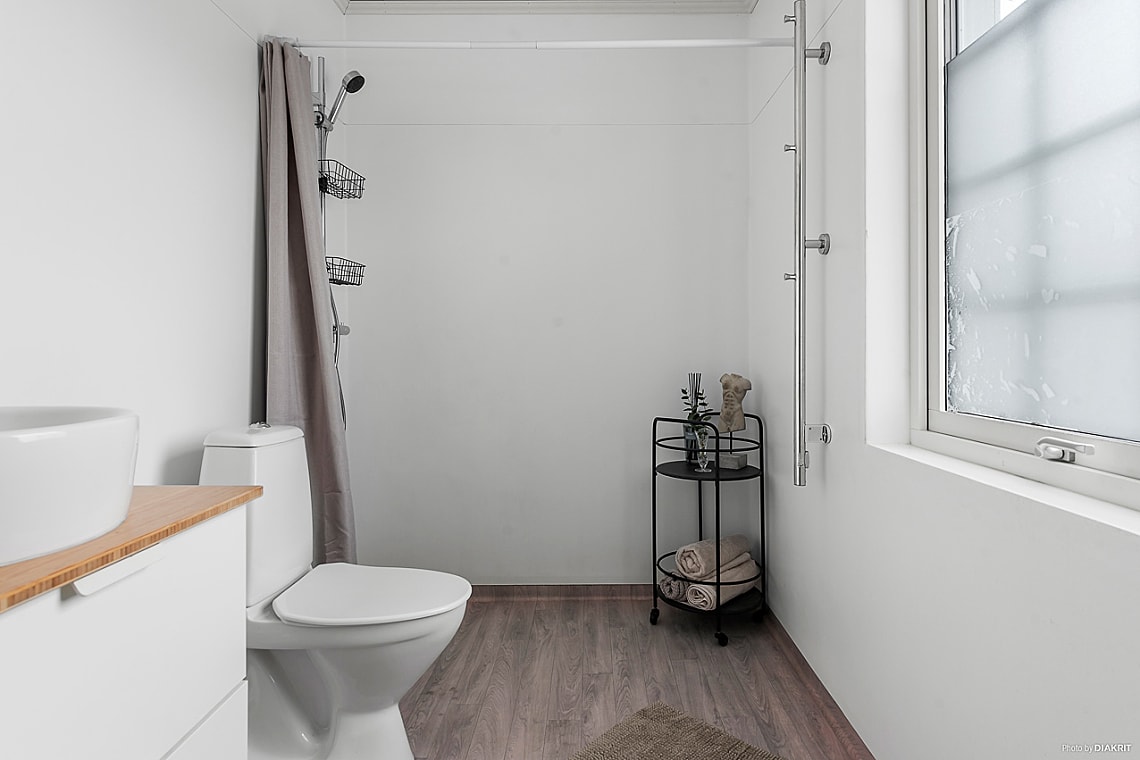 Ljust badrum med plastmatta på golv och väggar. Här finns handfat på kommod, WC och dusch. Praktiskt fönster för ljusinsläpp och vädring.