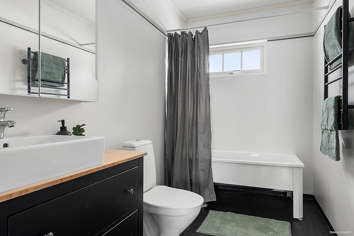 Här finns handfat på kommod, spegelskåp, WC och badkar. Mindre fönster för ljusinsläpp och vädring.