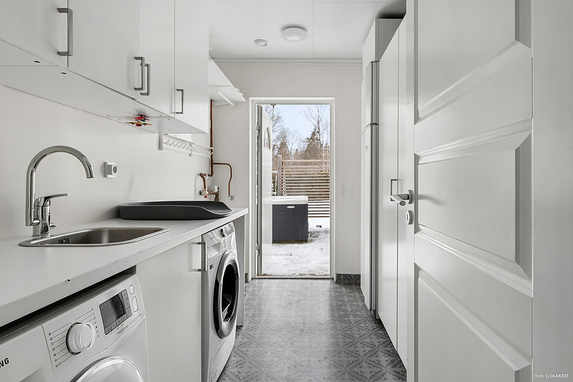 Praktisk tvättstuga med gott om förvaring och bänkyta med tvättho. Tvättmaskin och torktumlare.