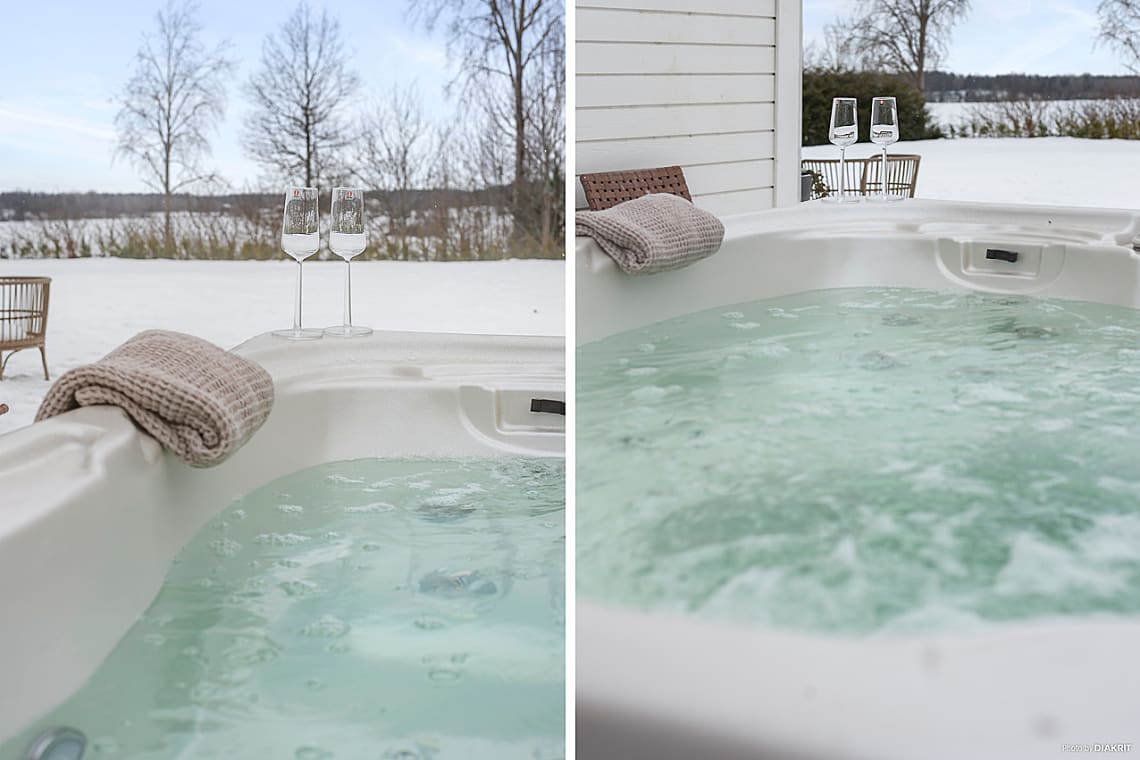 Den plana tomten bjuder på gräsmatta med gott om plats för lek och aktivitet, ett inbjudande spabad för avkoppling samt ett uppvärmt dubbelgarage som ger både komfort och bra förvaringsmöjligheter.