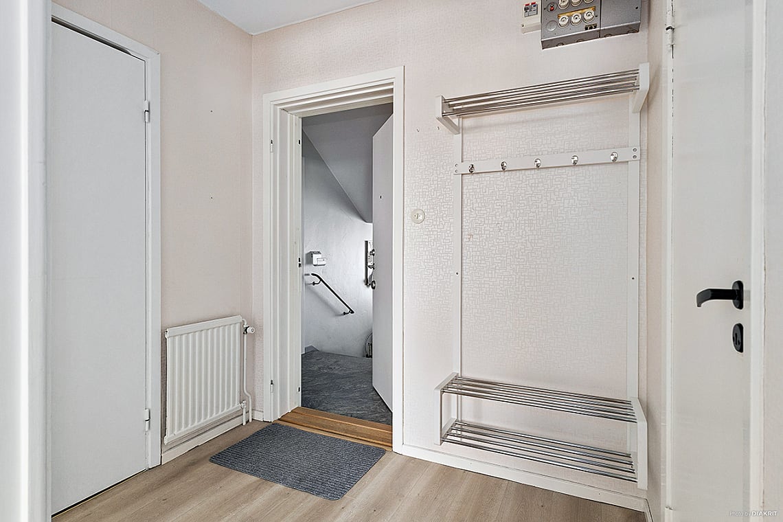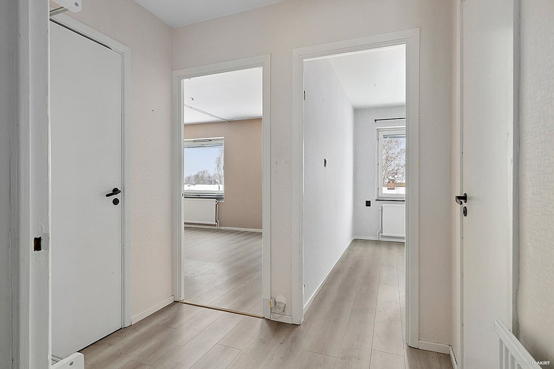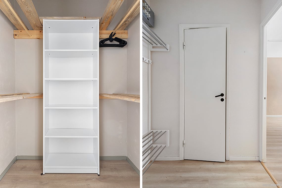 Ljust laminatgolv och ljusa väggar. avhängningsmöjligheter och ingång till klädkammare