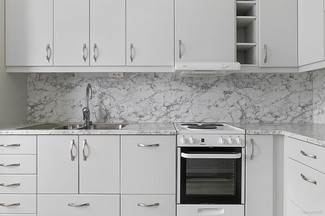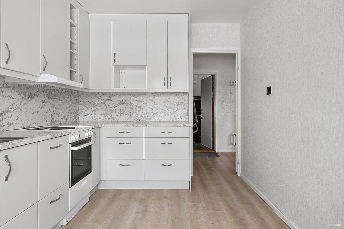 Laminatgolv och ljusa väggar. Släta skåpsluckor med rostfria beslag. Spis, ugn, fläkt och kombinerad kyl och frys.