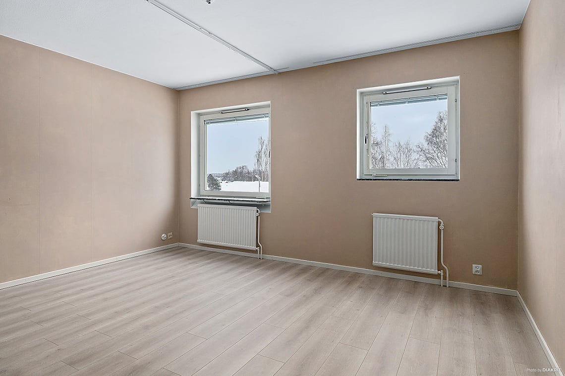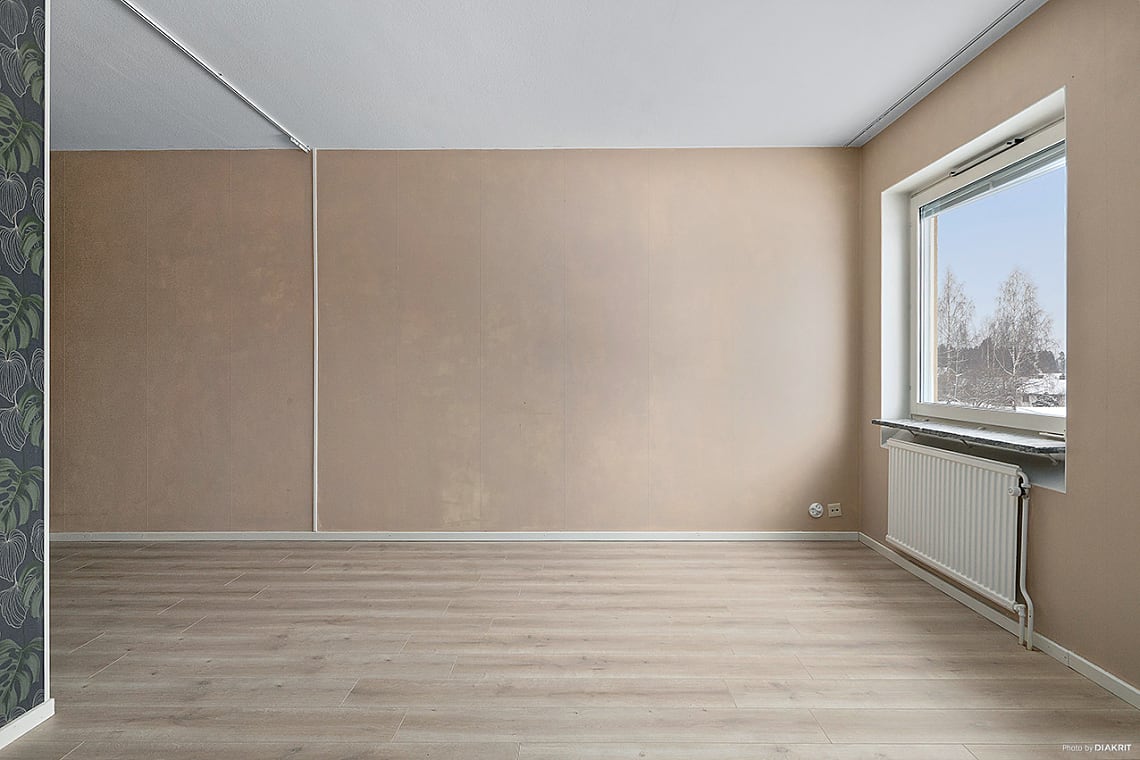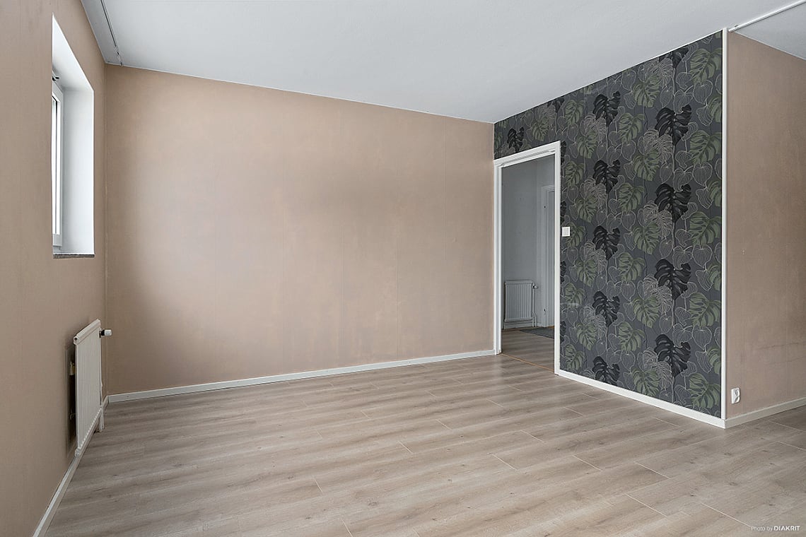 Ljust laminatgolv och beige väggar samt fondväggar. Plats för soffgrupp och tv-möbel