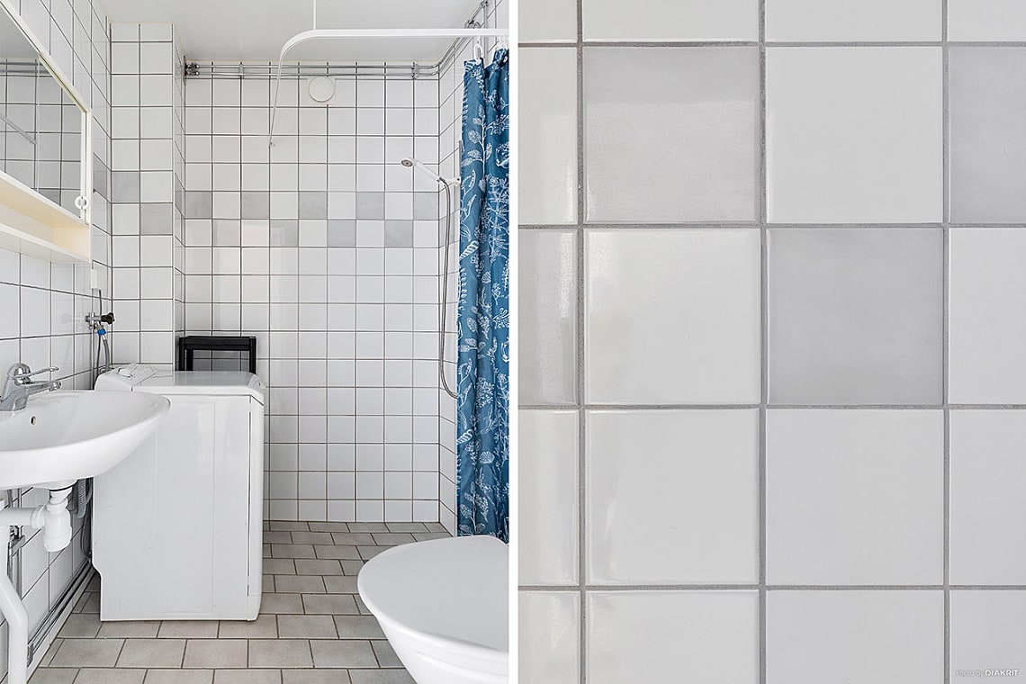 Helkaklat badrum med underliggande golvvärme. wc, handfat, spegelskåp och toppmatad tvättmaskin.