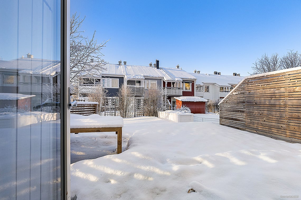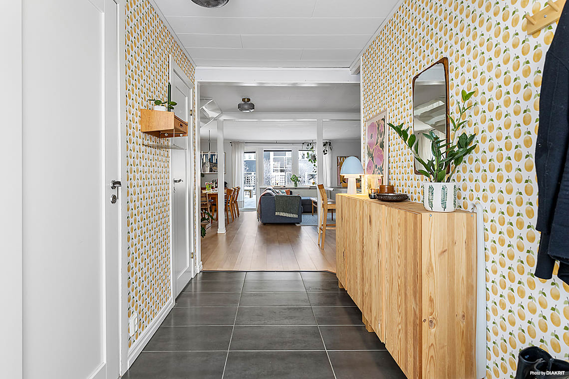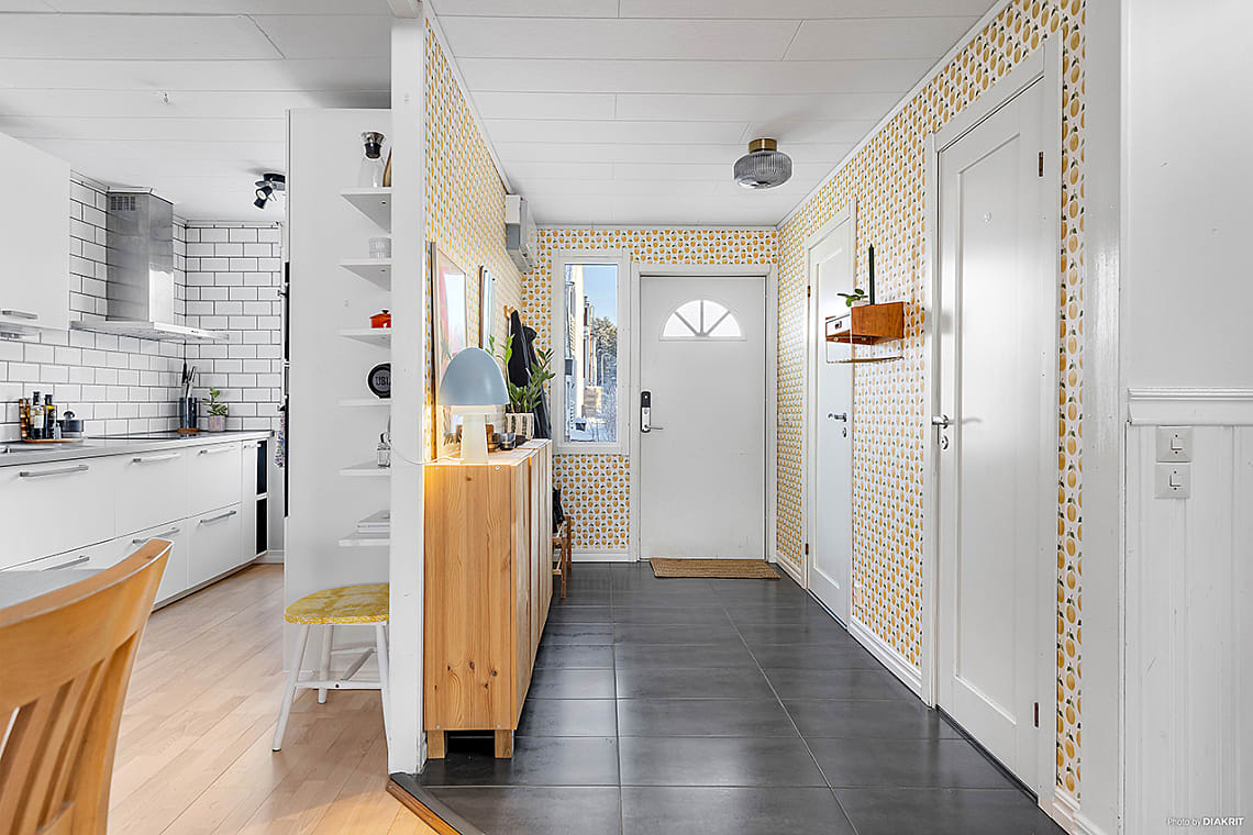 Entréplanet präglas av en öppen och inbjudande planlösning mellan kök, matplats och vardagsrum, en perfekt yta för såväl vardagsliv som sociala tillställningar. De generösa fönsterpartierna ger ett fint ljusflöde och skapar en luftig atmosfär. Härifrån nås en av bostadens två trädäckade altaner. Den större altanen ligger i soligt syd/västläge och blir en naturlig samlingsplats under årets varmare månader. I anslutning finns en liten gräsmatta, perfekt för lek eller odling. En stor och välvuxen häck ramar in tomten och skapar ett insynsskyddat och ombonad trädgård.