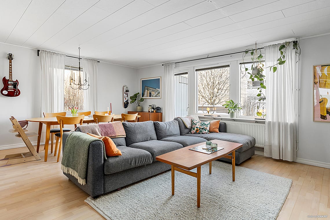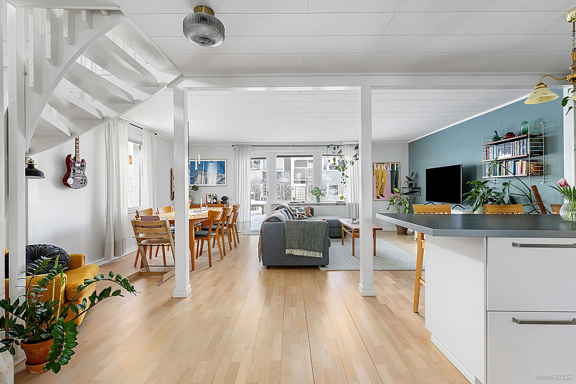 Ljust och luftigt vardagsrum med öppen och social planlösning mot köket, perfekt för såväl vardagsliv som umgänge med familj och vänner. Här finns gott om plats för större soffgrupp med tillhörande möbler samt matbord för trevliga middagar. Generösa fönsterpartier ger fint ljusinsläpp. Från vardagsrummet nås trappan som leder upp till övre plan och bostadens soliga uteplts.