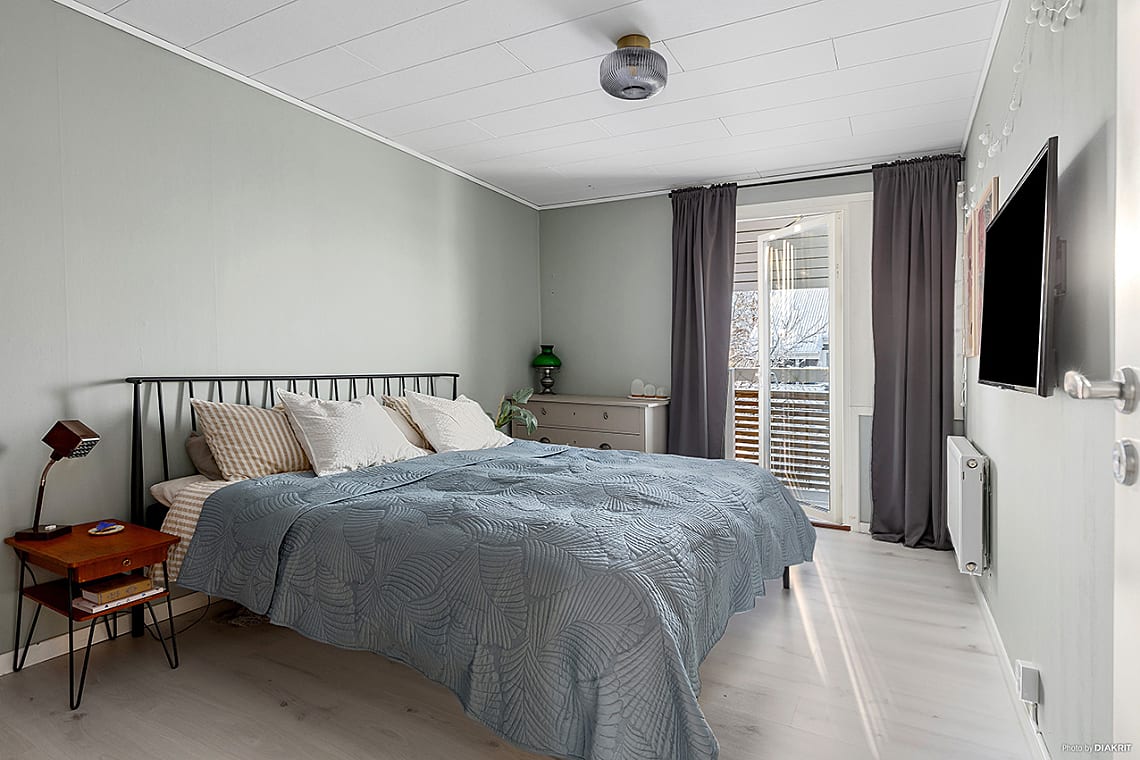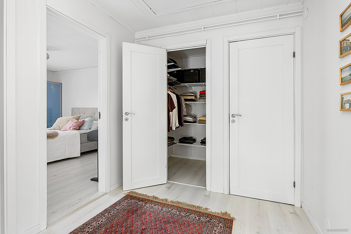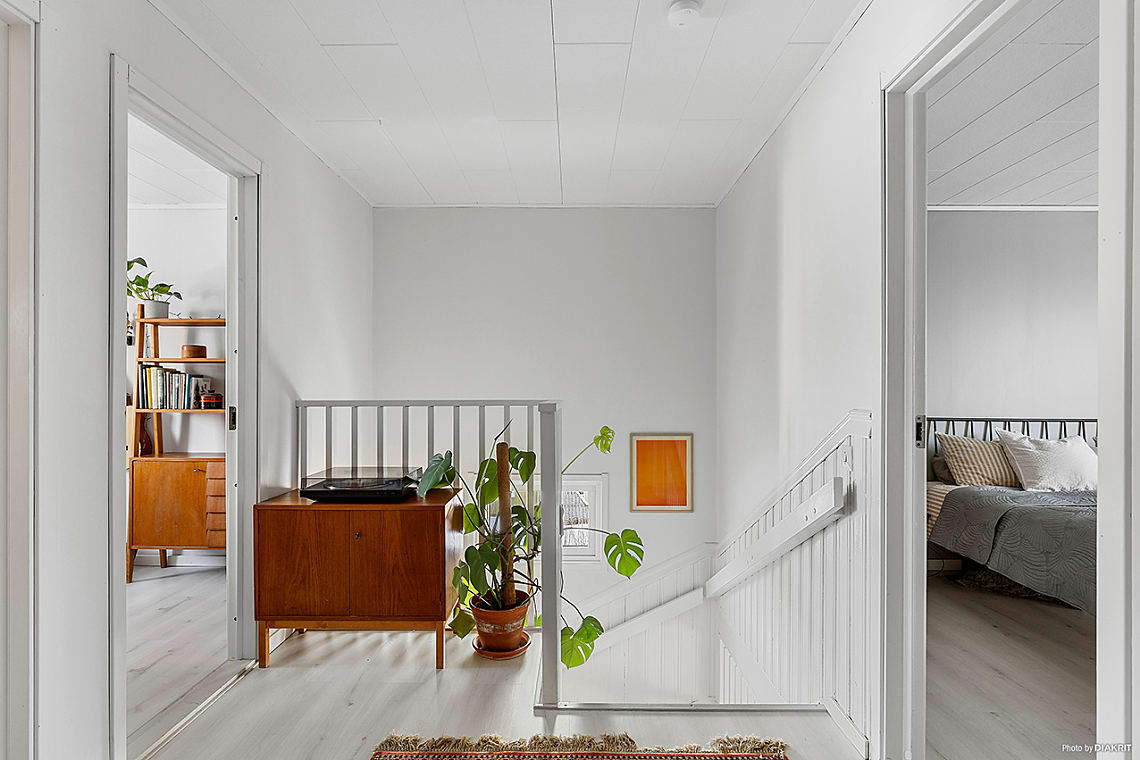 Övre plan inrymmer fyra sovrum i bra storlek med plats för säng, förvaring och övrigt möblemang efter behov. Perfekt för den större familjen eller för den som önskar hemmakontor eller gästrum. Ett av sovrummen har utgång till bostadens balkong, en härlig plats att njuta av morgonkaffet eller en stund i solen.