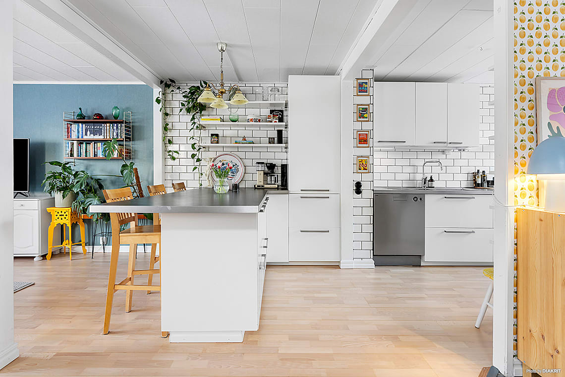 Ljust och inbjudande kök med mycket skåpsförvaring och arbetsyta.