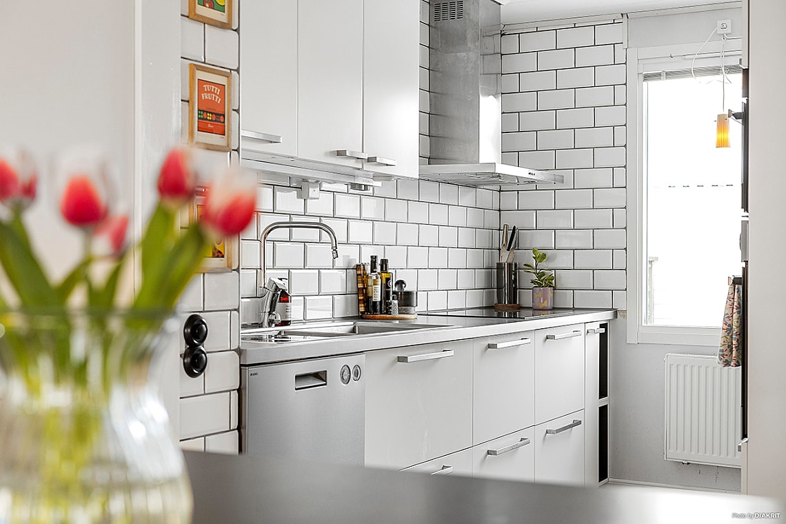 Köket är utrustat med inbyggnadsugn och mikro i bekväm arbetshöjd, spishäll, fläkt, diskmaskin samt kyl och frys.