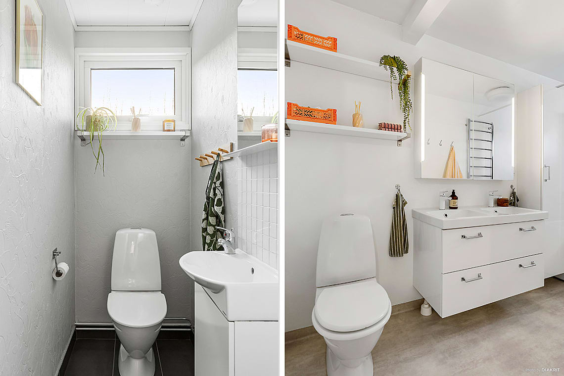 Utrymme med handfat i kommod och WC.