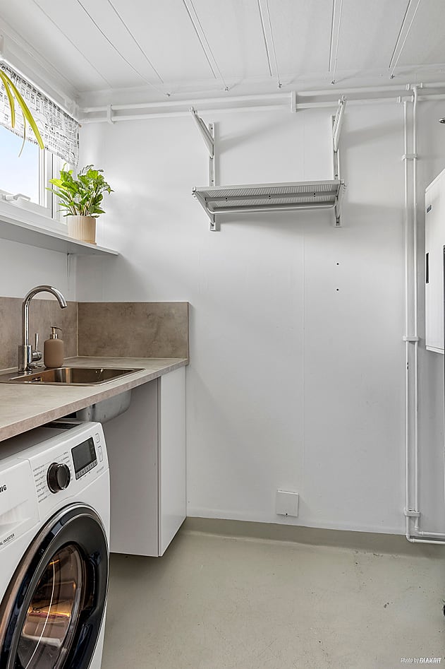 Praktiskt utrymme med tvättmaskin och bänkyta med tvättho.