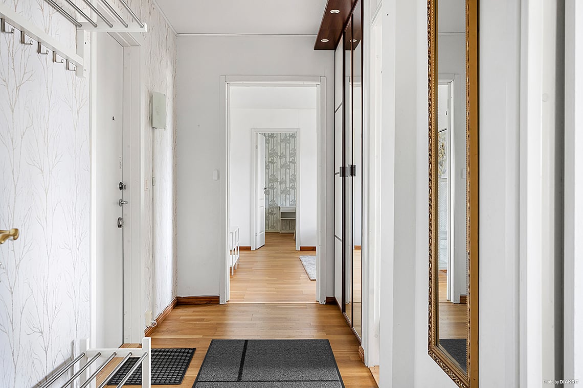 Rymlig hall med garderob samt plats för avhängning av ytterkläder och skor.