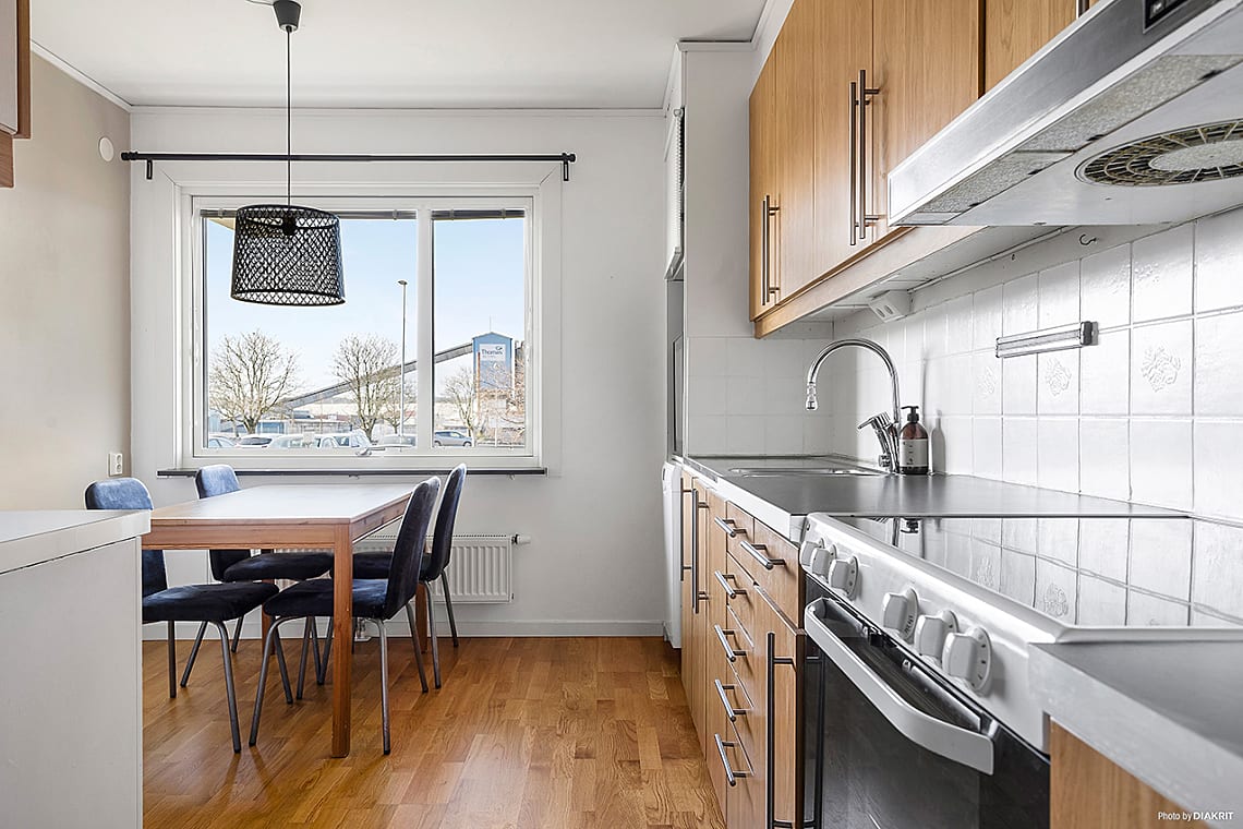 Bra och stilfullt arbetskök med goda förvaringsmöjligheter och plats för matbord intill fönster.