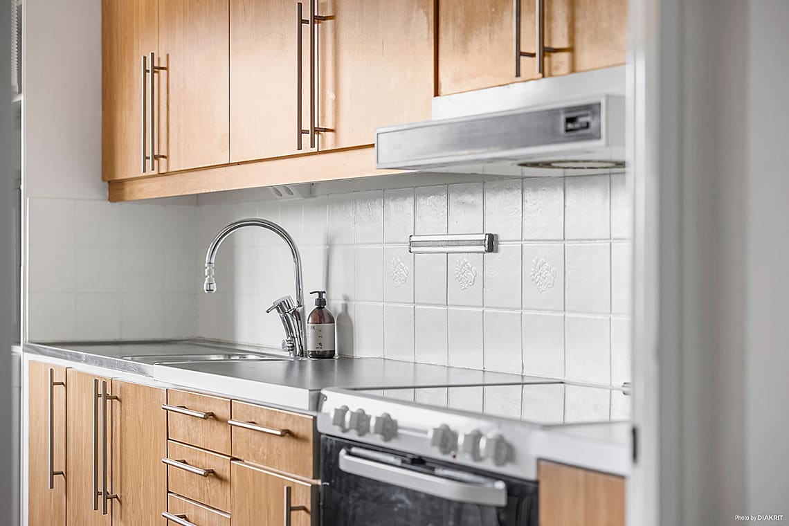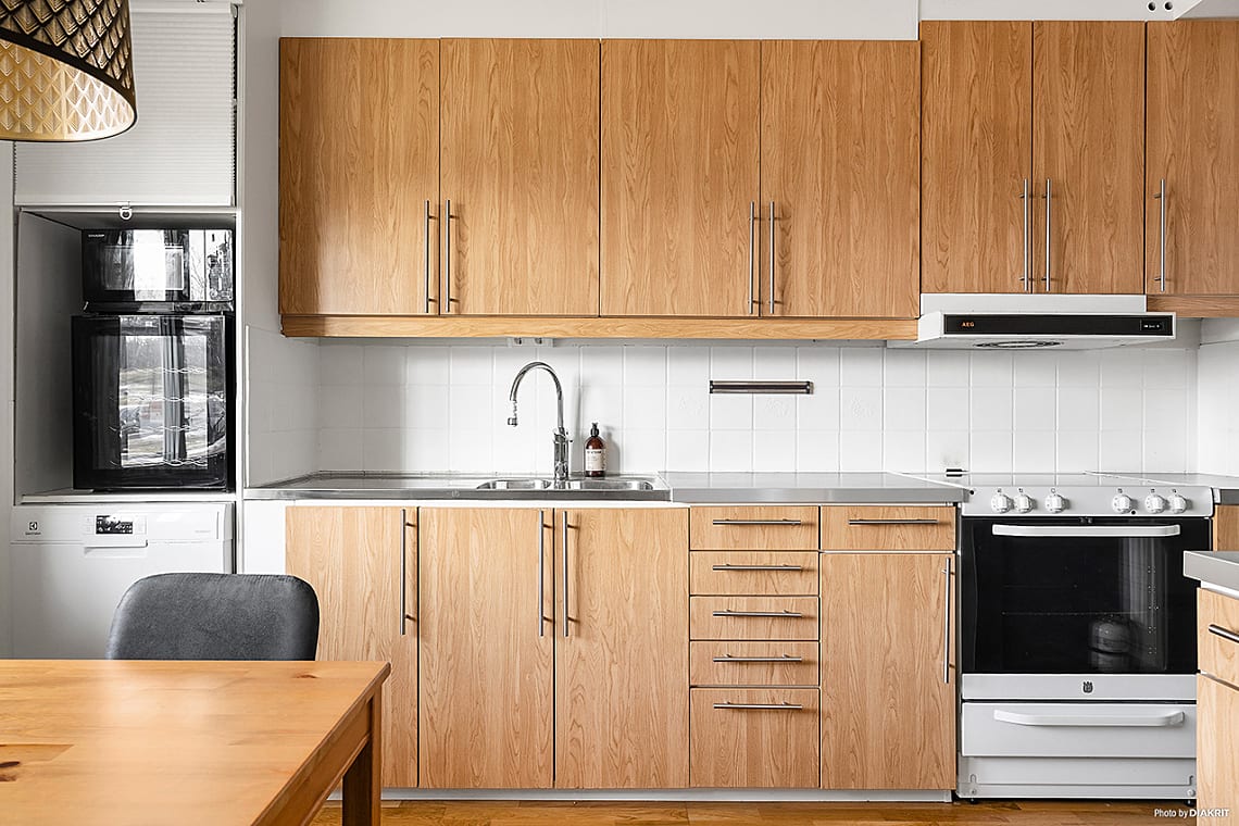 Köket är utrustat med ugn med spishäll, fläkt, diskmaskin samt kyl/frys och vinkyl.