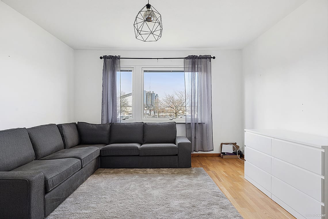Ljust vardagsrum som ger gott om plats för soffgrupp med tillhörande möbler.