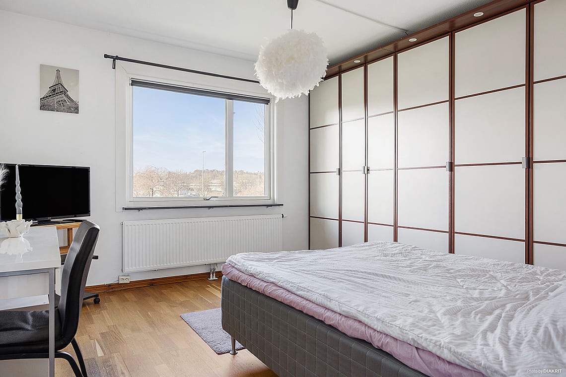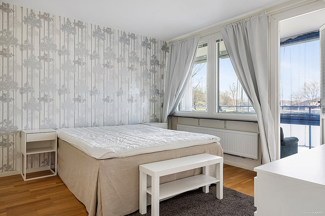 Rymligt sovrum med plats för dubbelsäng med tillhörande sängbord och förvaringsmöbel. Härifrån når vi bostadens rymliga och inglasade balkong.