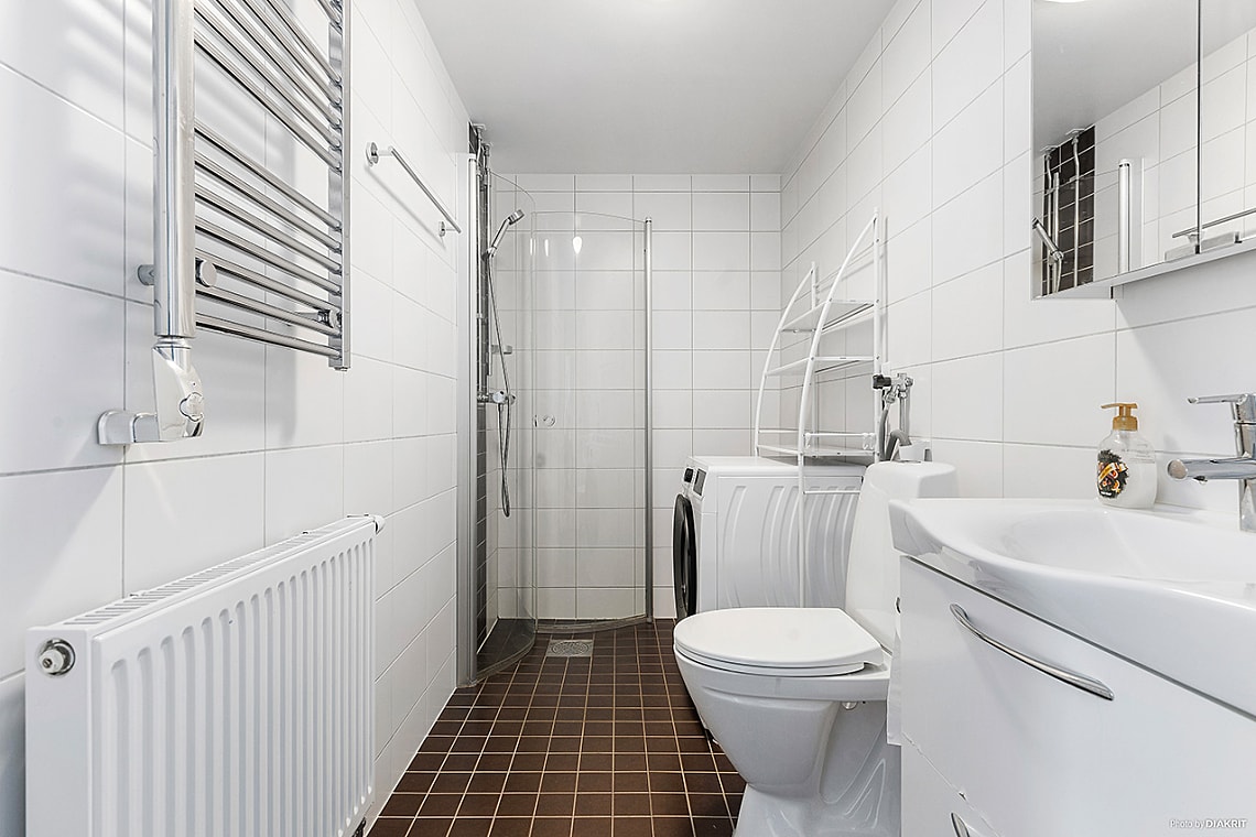 Helkaklat badrum med vita kaklade väggar och ett mörkt klinkergolv. Här finns handfat i kommod, spegelskåp, WC, dusch och tvättmaskin.