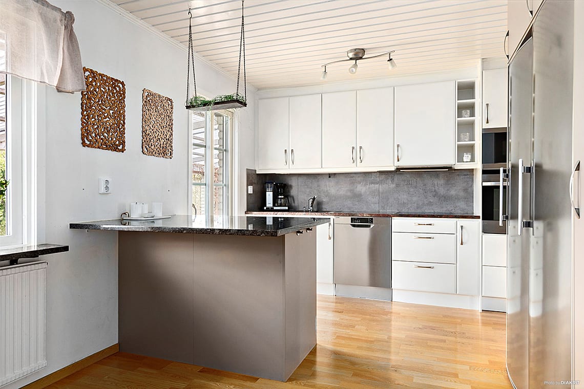 Modernt kök med ljusa skåpluckor och fina bänkskivor av sten. Parkettgolv och ljusa väggar. Köksö med förvaring och två sittplatser intill. Den maskinella utrustningen består av spishäll, fläkt, diskmaskin, inbyggd ugn och mikro samt kyl och frys i fullhöjd. Samtliga i rostfritt utförande.