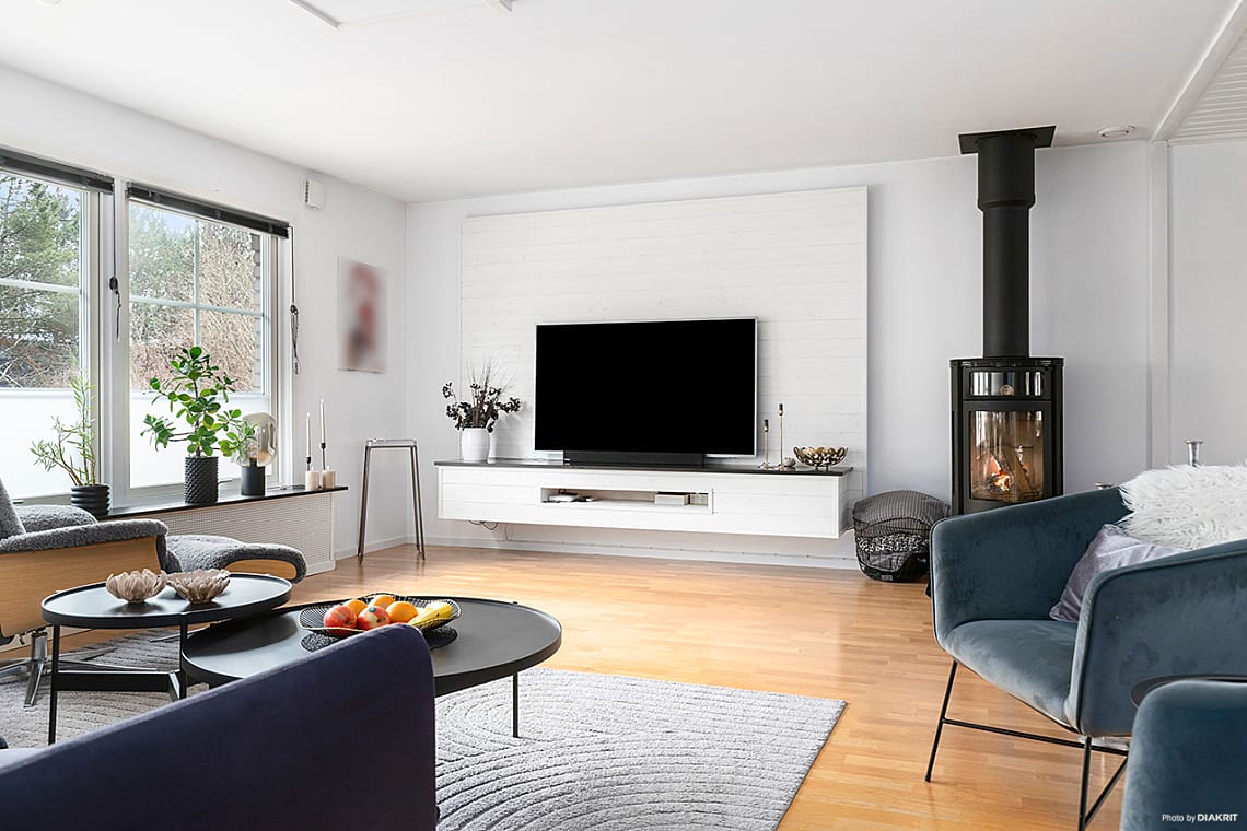 Rymligt vardagsrum med ett härligt ljusinsläpp. Parkettgolv och ljusa väggar. Här finns gott om plats för soffa och annat möblemang. En braskamin värmer gott och höjer mysfaktorn.