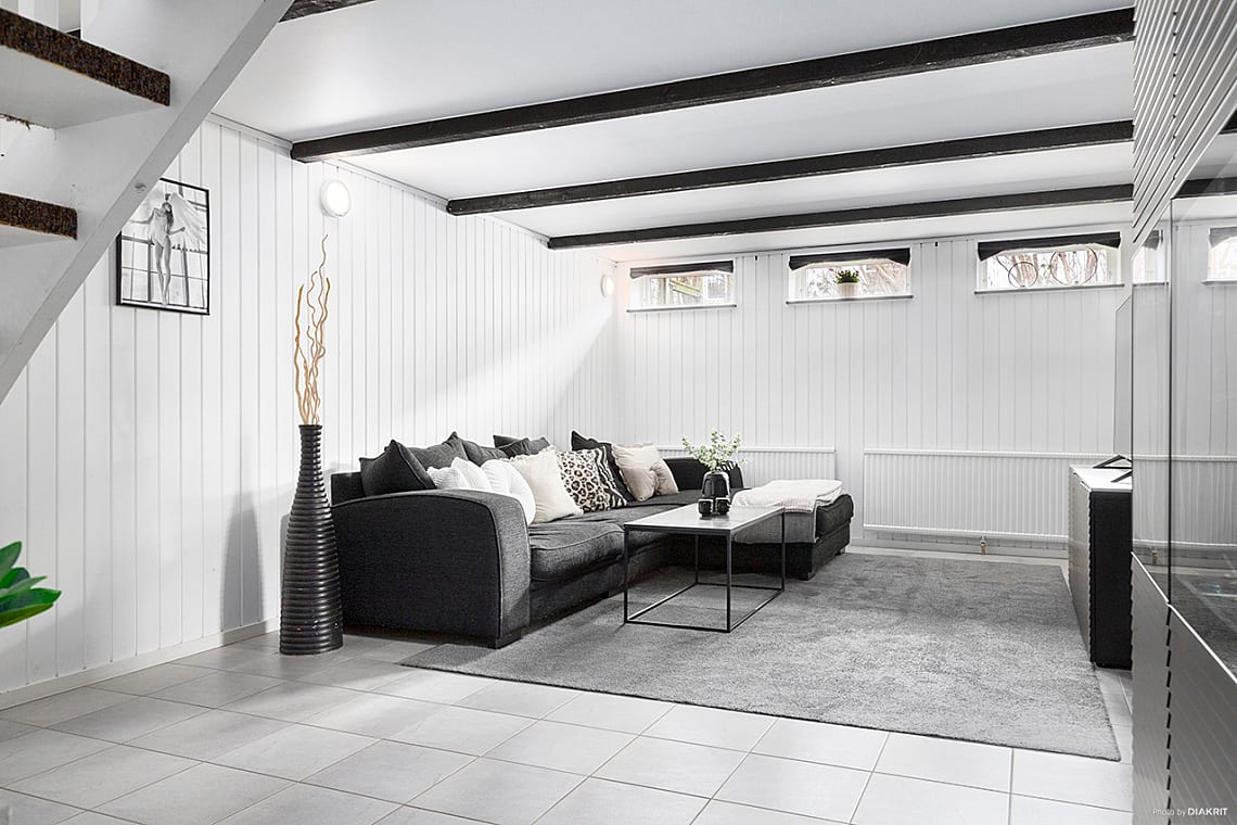 Generöst rum med plats för soffa och annat möblemang. Ljusa väggar med träpanel och klinkers på golvet.