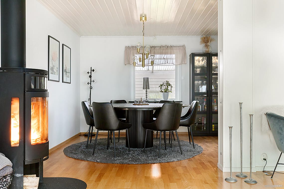 I anslutning till köket, med öppen planlösning mot vardagsrummet finns matplatsen. Här ryms ett stort bord för trevliga middagar.
