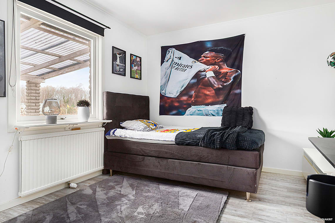 Plats för säng och annat möblemang. Laminatgolv och ljusa väggar.