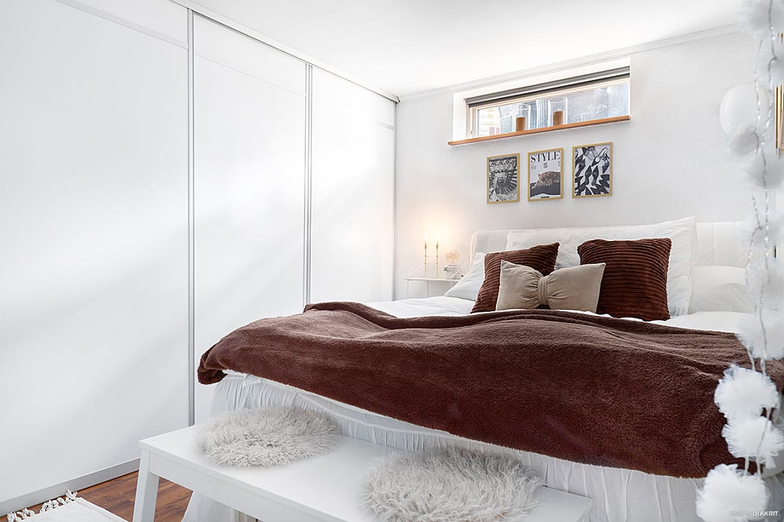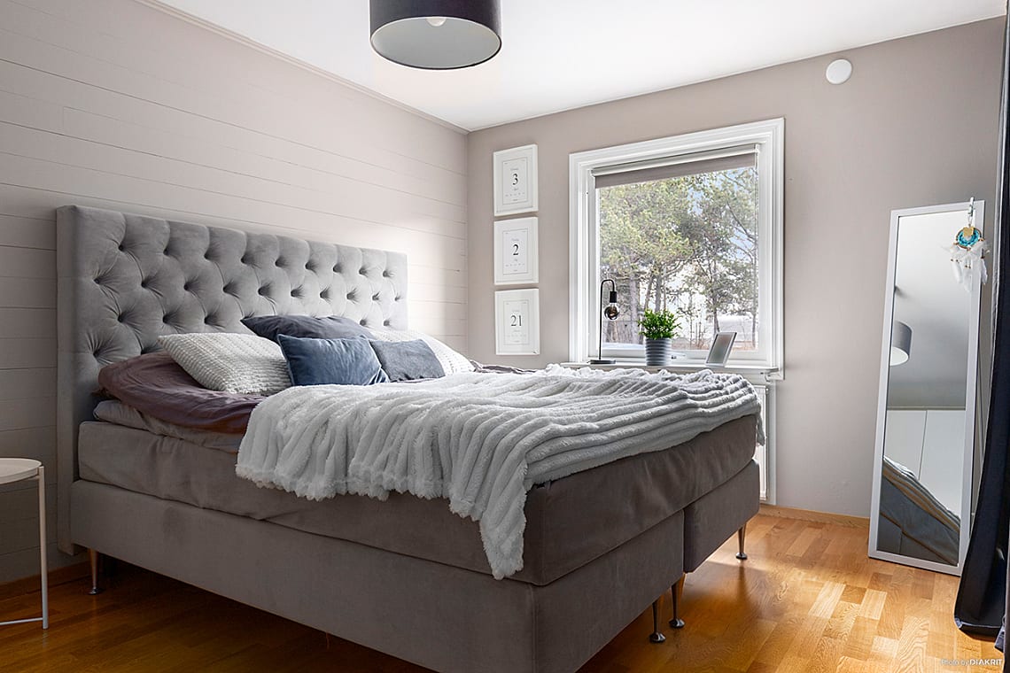 Plats för större säng. Praktisk skjutdörrsgarderob. Laminatgolv och ljusa väggar.