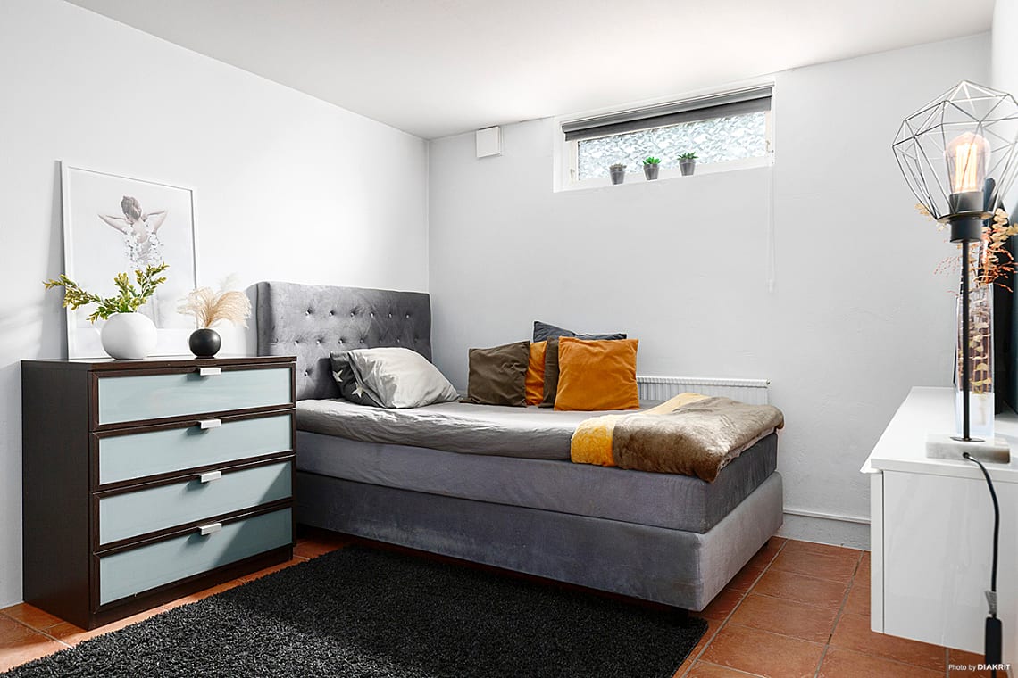 Plats för större säng. Klinkergolv och ljusa väggar.