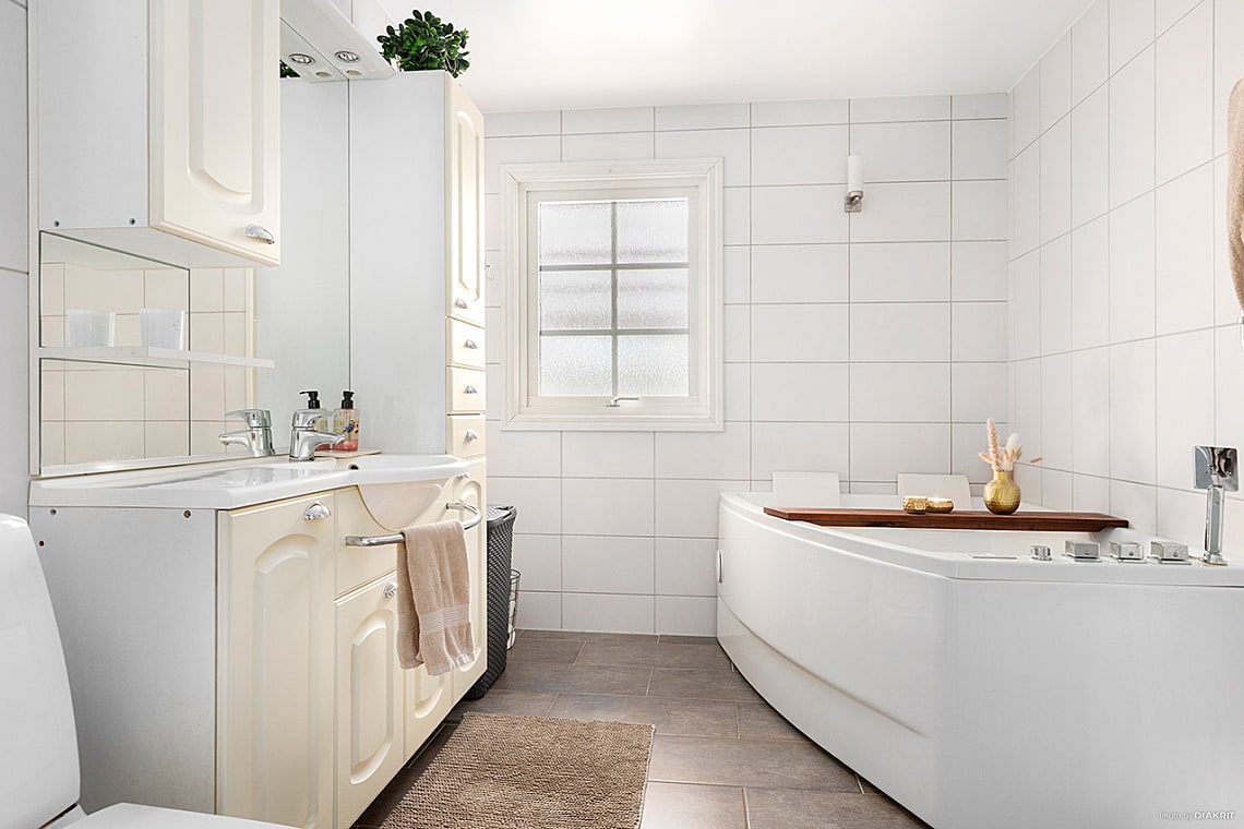 Helkaklat badrum med klinkergolv. Här finns WC, tvättställ i kommod, duschplats och badkar med plats för två. Fönster för vädring.