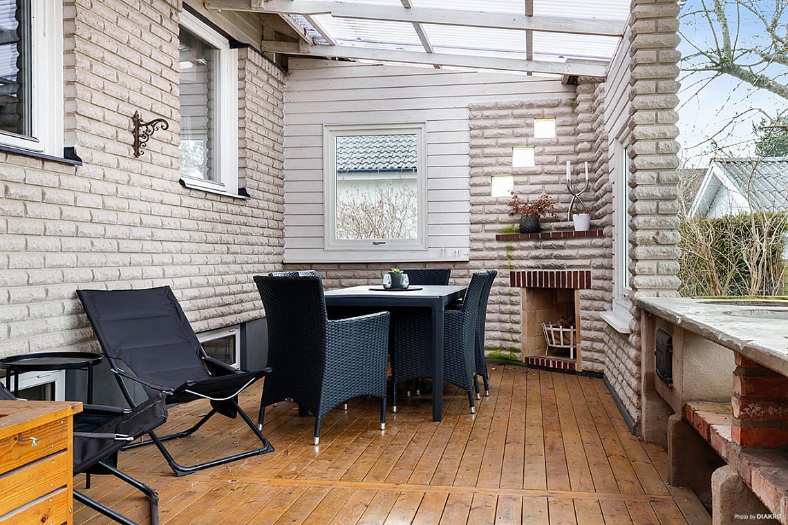 Från köket nås husets uteplats. Här ligger trall på golvet ett tak skyddar mot eventuella väderomslag. Praktiskt utekök med blick mot trädgården.