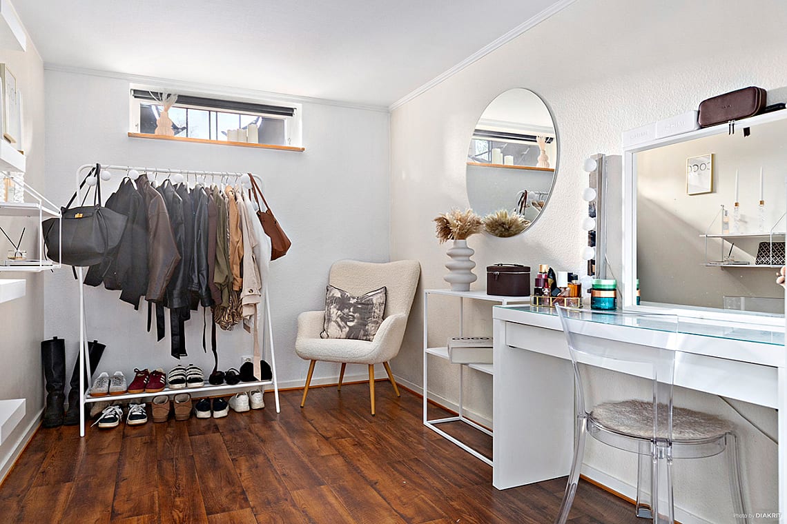 Här finns plats för dubbelsäng och annat möblemang. Gott om förvaringsutrymme i tre garderober. Parkettgolv och målade väggar, varav en med träpanel.