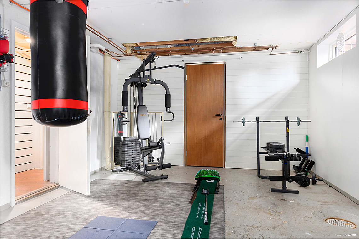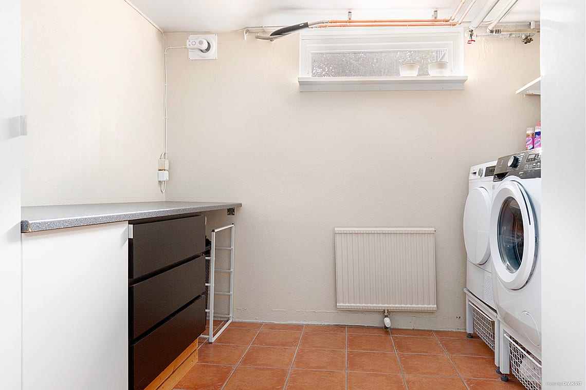 Här finns tvättmaskin, torktumlare och praktisk arbetsbänk.