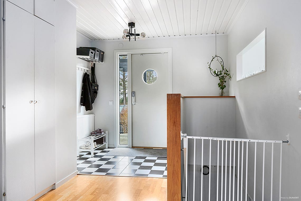 Välkomnande hall med praktisk klinkers på golvet. Gott om plats för avhängning av ytterkläder både vid hatthylla och i inbyggda garderober.