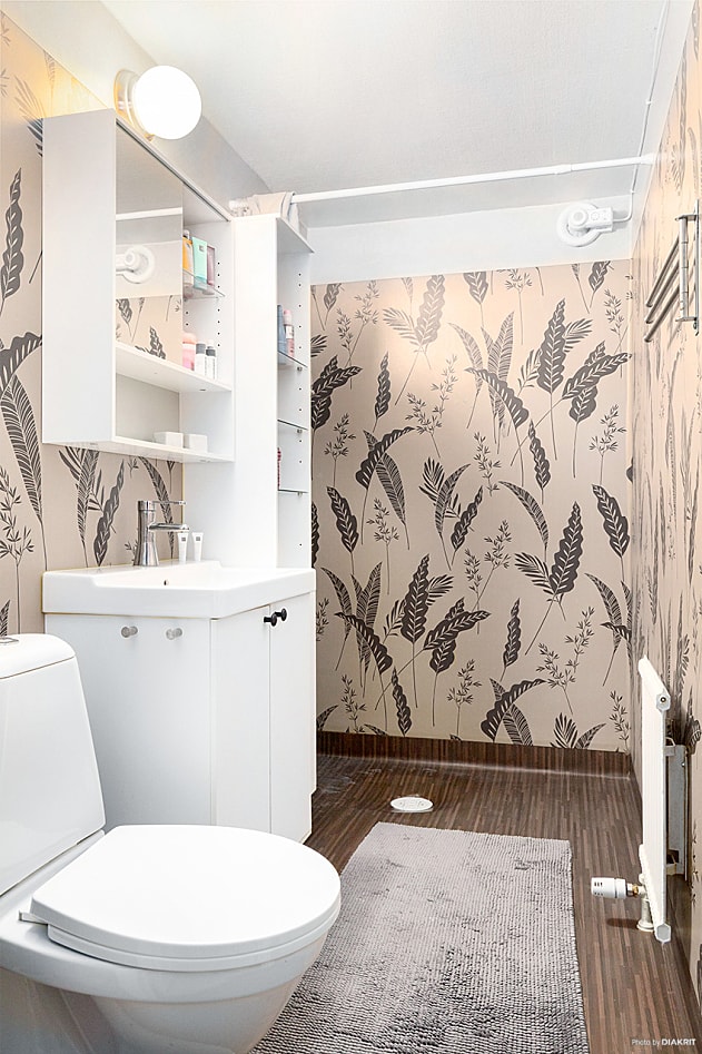 Plastmatta på väggar och golv. Utrustat med WC, tvättställ i kommod och duschplats.